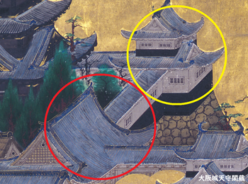 大坂夏の陣図屏風に描かれた大坂城の御殿の屋根と櫓の白漆喰